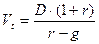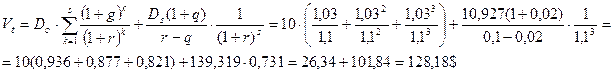 Пример. За прошедший год компания выплатила в качестве дивидендов по 10$ на акцию. Ожидается, что в течение следующих трех лет дивиденд будет расти на 3% в год, затем темп прироста снизится до 2% в год на весь оставшийся период. Определить теоретическую стоимость акции, если рыночная норма прибыли составляет 10%. Решение: D0 =10$; g = 0,03; q =0,02; S = 3.