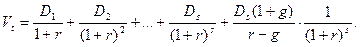Вариант с изменяющимися темпами прироста дивидендов. При оценке акций, дивиденды которых возрастают с изменяющимся темпом прироста, используется модель переменного роста. а) Предположим, что инвестор прогнозирует, что с высокой вероятностью наступит такой период S, после которого дивиденды будут расти с постоянным темпом В этом случае теоретическая стоимость акции определяется по формуле: