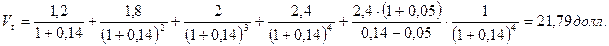 Пример. В течение последующих четырех лет компания планирует выплачивать дивиденды соответственно по 1,2; 1,8; 2; 2,4 долл. на акцию. Ожидается, что в дальнейшем дивиденд будет увеличиваться равномерно с темпом 5% в год. Рассчитайте теоретическую стоимость акции, если рыночная норма прибыли составляет 14%. Решение: Теоретическая стоимость акции: