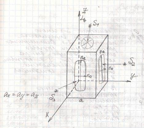 На грани кристалла показаны векторы, в направлении которых происходят колебания световых волн. Длины векторов пропорциональны n для соответствующих направлений. Луч S1, идущий вдоль главной кристаллографической оси L4, пересекает основание призмы так, что ax = ay. Двойное лучепреломление здесь отсутствует. Фигура изображает изменении n для этого сечения (окружность с радиусом r = n0). На вертикальных гранях существует равенство отрезков по ax и ay и неравенство по az. Это неравенство обуславливает анизотропность сечения, следовательно, происходит разложение обычного света на две поляризованные волны, которые колеблются во взаимно перпендикулярных направлениях с разными n. Фигура характеризуется изменением показателя преломления на гранях призмы и представляет собой эллипс с двумя неравными осями. Величина n = ne линейна при изменении его наклона относительно главной оси. Промежуточное обозначение n обозначается ne’.