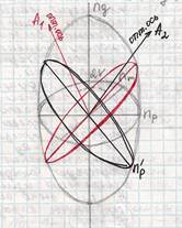 Геометрия трехосного эллипсоида определяется наличием двух симметрично расположенных круговых сечений, радиус-векторы которых равны nm. Перпендикулярно к круговым сечениям расположены оптические оси кристаллов a1 и a2. В оптически двуосных кристаллах различают три главных сечения: ng – np, в котором лежат оптические оси и это сечение называется плоскостью оптических осей. Острый угол между осями a1 и a2 называется углом оптических осей и обозначается 2V. Оси ng и np являются биссектрисами этого угла. Если биссектриса острого угла – ng, то кристаллы относятся к оптически положительным, если np – к оптически отрицательным. Если угол 2V равен 90 градусов, то кристалл является оптически нейтральным. ng – nm. nm – np.