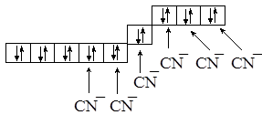 Связь характеризуется sp3d2-гибридной комбинацией орбиталей; для того, чтобы показать, что задействованы внешние d-орбитали, говорят о “внешней” гибридизации. Комплексный катион имеет октаэдрическое строение и является парамагнитным. В случае цианидного комплекса Есв > Епары, поэтому шесть 3d-электронов займут три орбитали, а остальные две будут заполняться электронами лигандов: