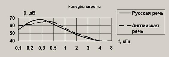 Рис. 3.3. Спектральный состав речевого сигнала В процессе прохождения воздушного потока из легких через голосовые связки и полости рта и носа образуются звуки речи, причем мощность гармоник частоты основного тона меняется (кривая 2 на Рис. 3.3). Области повышенной мощности гармоник частоты основного тона называются формантами (см. Рис. 3.3). Различные звуки речи содержат от двух до четырех формант. Высокое качество передачи телефонного сигнала характеризуется уровнем громкости, разборчивостью, естественным звучанием голоса, низким уровнем помех. Эти факторы определяют требования к телефонным каналам. Основными параметрами телефонного сигнала являются: · мощность телефонного сигнала PТЛФ. Согласно данным МСЭ-Т средняя мощность телефонного сигнала в точке с нулевым измерительным уровнем на интервале активности составляет 88 мкВт. С учетом коэффициента активности (0,25) средняя мощность телефонного сигнала PСР равна 22 мкВт. Кроме речевых сигналов в канал связи могут поступать сигналы управления, набора номера и пр. С учетом этих сигналов среднюю мощность телефонного сигнала принимают равной 32 мкВт, т.е. средний уровень телефонного сигнала составляет pСР = 10 lg (32 мкВт/1мВт) = - 15 дБм0;