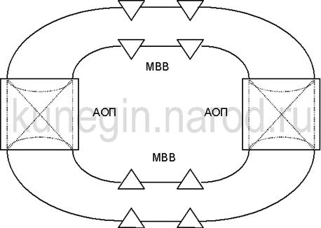 Рис. 6.50. Объединение колец посредством МВВ Схема объединения колец посредством МВВ представлена на Рис. 6.50. При этом несколько МВВ образуют своего рода распределенный узел оперативного переключения. Такой вариант возможен, когда число колец невелико и потоки между ними небольшие. Гораздо большие возможности предоставляет использование АОП (Рис. 6.51). При этом, как видно из рисунка, могут быть организованы и логические кольца, охватывающие различные цепочки МВВ. Вообще применение смешанной архитектуры, использующей как кольцевые структуры, так и АОП, позволяет эффективно строить сети, обеспечивая тот же уровень отказоустойчивости, что и у чисто кольцевой сети, при меньшей суммарной пропускной способности всех линий.