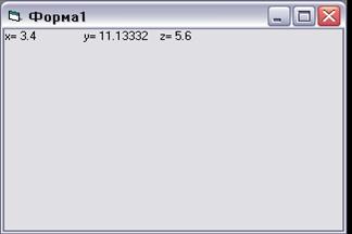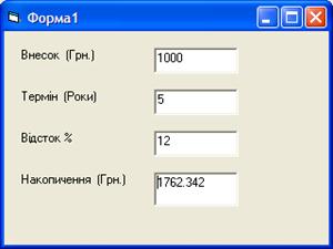 Рисунок 3.3. 6. Натиснути кнопку Начать на панелі Стандартная. 7. З'явиться вікно з повідомленням х =. В поле вводу ввести значення змінної – 3.4 і натиснути Ok або Enter. 8. З'явиться нове вікно з повідомленням z =. В поле вводу ввести значення змінної – 5.6 і натиснути Ok або Enter. З'являться результати обчислень: х=3.4 z=5.6 у =11.13332. Для введення і виведення інформації (початкових даних, коментарів, пояснень, результатів) можна також використовувати такі елементи управління як TextBox, ComboBox, ListBox, FlexGrid. Приклад. Використаємо елементи TextBox щоб створити інтерфейс додатка для обчислення накопичень на внески, блок-схема алгоритму якого було розглянуто раніше (Приклад 1). 1. Відкриємо нову форму. 2. Встановимо на ній 4 елементи TextBox. За замовчуванням VB дасть їм назви відповідно Текст1, Текст2, Текст3, Текст4. Погодимось з такими іменами, але очистимо поля елементів, підготувавши їх до введення даних. Для цього клацнемо правою мишкою на елементі Текст1 і в контекстному меню його клацнемо лівою мишкою пункт Свойства. Праворуч від форми або над нею з’явиться вікно Свойства–Текст1. 3. Виділимо властивість Text і видалимо слово” Текст1”. Воно щезне і з поля елемента Текст 1. Якщо не закривати вікно Свойства –Текст1 і клацнути на елементі Текст2, то панель Свойства –Текст1 автоматично буде заміщена панеллю Свойства-Текст 2, навіть з виділеною властивістю Text. Очистимо її. Так само очистимо поля інших елементів TextBox.