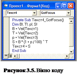 End Sub, між якими записується код програми. Private Sub Текст4_GotFocus() Dim B!,T!,p!,S! B=Val(Текст1.Text) t= Val(Текст2.Text) p= Val(Текст3.Text) S=B*(1+p/100)^t Текст4.Text=S End Sub