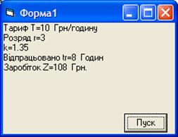 Private Sub Пуск_Click() Dim Z!, r%, t!, tr!, k! Т = Val(InputBox("Т", "Укажіть тариф")) r = Val(InputBox("r", "Тарифний розряд")) tr = Val(InputBox("tr", "Відпрацьований час")) Select Case r Case 1: k = 1: Case 2: k = 1.1: Case 3: k = 1.35: Case 4: k = 1.5: Case 5: k = 1.7: Case 6: k = 2: Case 7: k = 2.2 End Select Z = t * tr * k Print "Тариф Т=" & Т; " Грн/годину" Print "Розряд r=" & r Print "k=" & k Print " Відпрацьовано tr=" & tr & " Годин" Print "Заробіток Z=" & Z & " Грн." End Sub