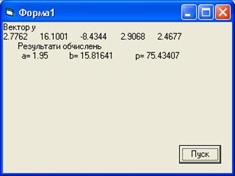 End Sub 6.Після заголовку процедури набрати текст(тіло програми). Option Base 1 Dim y! Private Sub Команда1_Click() Dim a!, b!, p! N=InputBox(“n=”) ReDim y(n) X=Array(1.5, -6.7, 8.35, -1.9, 0.7) Print “Вектор y” For i=1 to n Y(i)=x(i)/cos(i) Print y(i);Spc(3); Next і: Print A=SV(5,x) B=SV(n,y) P=Atn(a)+4.7*b Print Tab(5);”Результати обчислень” Print Spc(5);”a=”; a; Spc(5);”b=”; b; Spc(5); “p=”; p End sub 7. У меню Разработать обрати команду Добавить модуль. З’явиться вікно Add Module. Вибрати Новый і натиснути кнопку Открыть. 8. З’явиться вікно Проект1-Модуль 1(Код). Надрукуємо ім’я процедури Function SV(n,z) і натиснемо Enter. З’явиться End Function (кінець процедури). 9. Після заголовку процедури набрати текст(тіло процедури). Function SV(n,z) S=0 For i=1 to n S=s+z(i) Next i SV=s End Function 10. Запустити команду на виконання, натиснувши кнопку Начать на панелі інструментів Стандартная. 11. У вікні Форма1 клацнути по командній кнопці Пуск. Ввести розмір масиву n. (n <=5=розміру массиву х). Результат виконання процедури буде показаний у вікні форми (рис. 6.1).