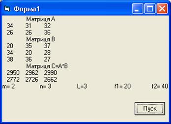 У меню Разработать вибрати команду Добавить модуль. У вікні Add Module обрати Новый і натиснути кнопку Открыть. З’явиться вікно Проект1 – Модуль1 (Код). Надрукуємо ім’я процедури Sub Form(k,f1,f2,z!()) і натиснемо Enter. З’явиться End Sub (кінець процедури). Після заголовку процедури набрати текст(тіло процедури). Private Sub Form(k, l, f1, f2, z!()) For u = 1 To k t = 2 For q = 1 To l z(u, q) = Int((f2 - f1 + 1) * Rnd) + f1 Форма1.Print Tab(t); z(u, q);: t = t + 7 Next q В цій процедурі елемент матриці створюється за допомогою генератора випадкових чисел. Для введення реальної конкретної матриці досить замінити оператор z(i,j)=int((f2-f1+1)*Rnd)+f1 на z(i,j)=Val(InputBox(“Введіть елемент матриці”). В меню Разработать вибрати команду Добавить модуль. В вікні Add Module вибрати Новый і натиснути кнопку Открыть. З’явиться вікно Проект1 – Модуль2 (Код). Надрукуємо ім’я процедури Sub Sum (k,z!(),s!) і натиснемо Enter. З’явиться End Sub (кінець процедури). Після заголовку процедури набрати текст(тіло процедури). Sub Sum(i, j, n, S) S = 0 For k = 1 To n S = S + a(i, k) * b(k, j) Next k End Sub 12. Запустити команду на виконання, натиснувши кнопку Начать на панелі інструментів Стандартная. 13.У вікні Форма1 клацнути по командній кнопці Пуск. Ввести початкові дані m,n,L,f1,f2. Результат виконання процедури буде показаний у вікні форми (рис.6.2).