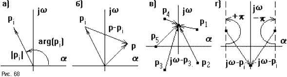 Каждый корень можно изобразить вектором на комплексной плоскости (рис.68а), тогда разность p - pi изобразится разностью векторов (рис.68б), где p - любое число. Еcли менять значение p произвольным образом, то конец вектора p - pi будет перемещаться по комплексно плоскости, а его начало будет оставаться неподвижным, так как pi - это конкретное неизменное значение. В частном случае, если на вход системы подавать гармонические колебания с различной частотой