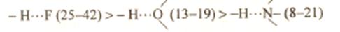 водород в данном случае образует две химические связи, причем они не равноценны. Образование водородной связи обусловлено тем, что в полярных молекулах А-Н или полярных группах -А-Н поляризованный атом водорода обладает уникальными свойствами: отсутствием внутренних электронных оболочек, значительным сдвигом электронной пары к атому с высокой электроотрицательностью и очень малым размером. Поэтому водород способен глубоко внедряться в электронную оболочку соседнего отрицательно поляризованного атома. Атомы А и В могут быть одинаковыми, как при взаимодействии HF