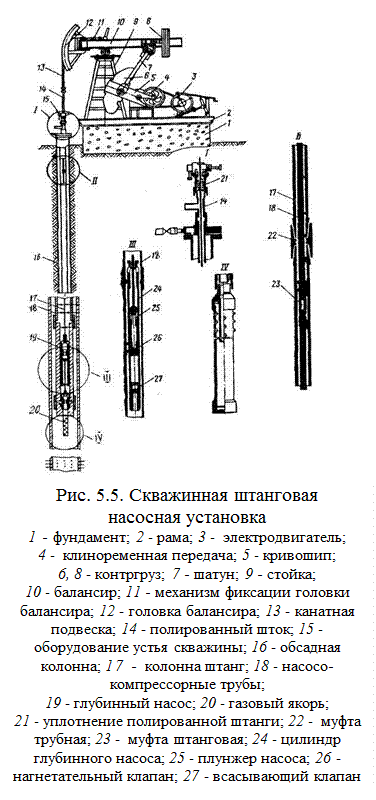 Штанговая скважинная насосная установка. В основу способа эксплуатации скважин штанговыми насосами положено использование объемного насоса возвратно поступательного действия, спускаемого в скважину и приводимого в действие приводом, расположенным на поверхности. Привод и скважинный насос соединены вместе посредством механической связи. Весь этот комплекс оборудования называют скважинной штанговой насосной установкой (СШНУ). Скважинная штанговая установка состоит из привода, устьевого оборудования, колонны насосных штанг, колонны насосно-компрессорных труб, скважинного насоса и вспомогательного подземного оборудования. В отдельных случаях какой-либо из элементов может отсутствовать, тогда его функцию выполняют другие элементы СШНУ. Привод предназначен для преобразования энергии двигателя в механическую энергию колонны насосных штанг, движущихся возвратно-поступательно. Колонна насосных штанг представляет собой стержень, состоящий из отдельных штанг, соединенных друг с другом резьбовыми соединениями. Колонна насосных штанг передает механическую энергию от привода к скважинному насосу. Скважинный насос, как правило, плунжерный, преобразует механическую энергию движущихся штанг в энергию откачиваемой пластовой жидкости. Колонна насосно-компрессорных труб служит каналом для подъем откачиваемой пластовой жидкости и обеспечивает удержание на весу цилиндра скважинного насоса. Устьевое оборудование герметизирует внутреннюю полость колонны НКТ, ее соединения с нефтепромысловым коллектором, а также фиксирует верх колонны НКТ. Вспомогательное подземное оборудование устанавливается в зависимости от особенностей каждой скважины. В комплект могут входить: якорь, фиксирующий низ колонны НКТ относительно эксплутационной колонны, газовые и песочные якоря или сепараторы для отделения из пластовой жидкости, поступающей на прием скважинного насоса, газа и песка, иногда кла-паны-отсекатели пласта. В отдельных случаях колонна штанг может быть полой, и ее внутренняя полость используется в качестве канала для подъема пластовой жидкости. При этом колонна НКТ может отсутствовать, а цилиндр скважинного насоса фиксируется специальным якорем с пакером. В большинстве СШНУ (рис. 5.5) в качестве привода применяют балансирные станки-качалки. Балансирный станок-качалка состоит из рамы 2, установленной на массивном фундаменте 1. На раме смонтированы стойка 9, на которой с помощью шарнира укреплен балансир 10, имеющий на одном конце головку 12, на другом — шарнир, соединяющий его с шатуном 7. Шатун соединен с кривошипом 5, укрепленном на выходном валу редуктора. Входной вал редуктора посредством клиноременной передачи соединен с электродвигателем 3. Головки балансира соединены с колонной штанг с помощью канатной под Колонна насосных штанг соединяет канатную подвеску насоса с плунжером глубинного насоса. Колонна собирается из отдельных штанг 17. Штанги имеют длину от 6 до 10 м, диаметр от 12 до 25 мм и более, соединяются друг с другом посредством муфт 23. Полированный шток 14 имеет поверхность, обработанную по высокому классу чистоты, иногда ею называют первой или сальниковой штангой. Колонна насосно-компрессорных труб служит для подъема пластовой жидкости на поверхность и соединяет устьевую арматуру с цилиндром глубинного насоса. 