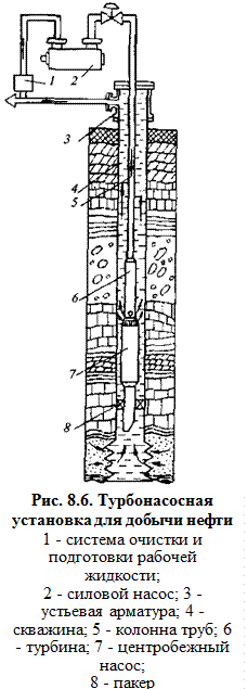 Кроме того, существуют особые конструкции турбонасосов для работы при более высоких температурах. Турбонасосы имеют следующие преимущества: —отсутствие погружного электродвигателя и кабеля исключает все сложности выполнения спускоподъемных операций в скважинах со значительной кривизной ствола, позволяет использовать турбонасосы для подъема жидкостей с высокими температурами, в том числе из геотермальных скважин; —незначительная габаритная длина скважинного агрегата по сравнению с электроприводными центробежными насосами дает возможность применять его в скважинах с большой интенсивностью набора кривизны, облегчает транспортные и монтажные, работы; —отсутствие клапанов в скважинном насосном агрегате обусловливает использование турбонасоса практически, без ограничений по кривизне ствола скважин вплоть до горизонтальных; —подшипники насоса и турбины гидростатического типа, что обеспечивает прочную и надежную работу опоры ротора агрегата; смазка подшипников выполняется предварительно очищенной и подготовленной жидкостью, что защищает подшипники от воздействия абразивных компонентов скважинной жидкости; —гибкость регулирования рабочих характеристик, широкий рабочий диапазон плавного изменения подачи насоса; —возможность применения скважинного турбонасосного агрегата сбрасываемого типа; —неограниченность глубины спуска турбонасоса; —в скважину могут вводиться различные химические реагенты, ингибиторы коррозии, деэмульгаторы и др.; —можно применить различные методы глушения скважин перед подземным ремонтом, в том числе при нахождении турбонасосного агрегата в скважине. Для спуска турбонасосного агрегата в скважину используются стандартные НКТ и оборудование, применяемые в нефтяной промышленности. Силовые поверхностные насосы выбираются из множества стандартных насосов компании WeirPumps' таким образом, чтобы обеспечивать любой эксплуатационный режим скважинного турбонасосного агрегата.