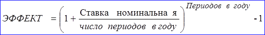 Возвращает действующие (эффективные) ежегодные процентные ставки, если заданы номинальная годовая процентная ставка и количество периодов, составляющих год. Функция ЭФФЕКТ вычисляется по формуле