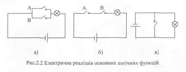 Логічне множення (кон'юнкція) позначається крапкою або в булевих формулах ніяк не позначається. Функцію І реалізують, наприклад, з'єднані послідовно замикаючі контакти декількох реле (рис. 2.2., б). Ланцюг в цьому випадку буде замкнутий тільки тоді, коли спрацюють всі реле: