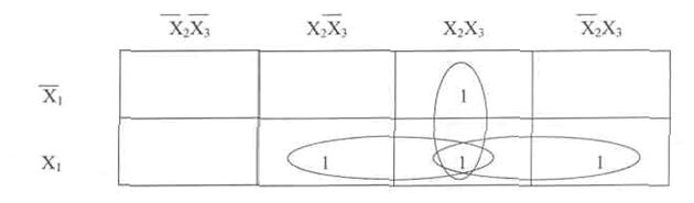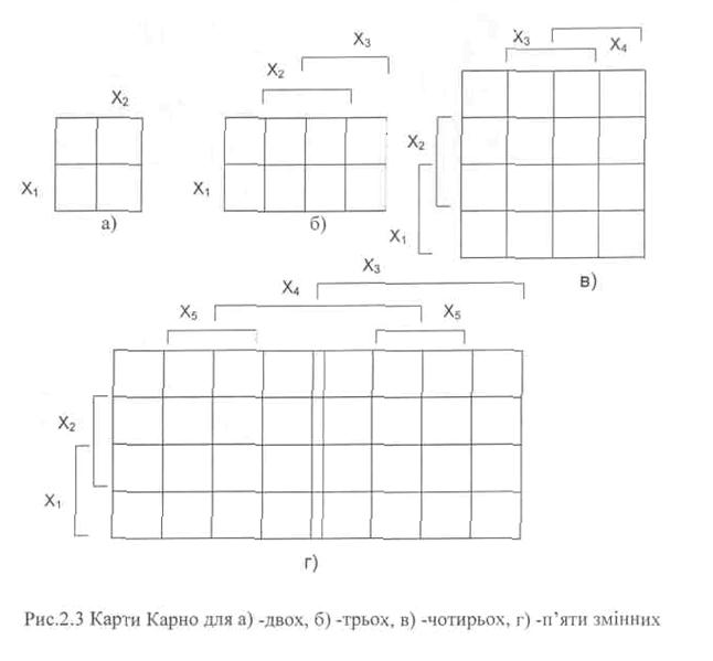 Як видно, отриманий кінцевий вираз явно простіше початкового. 2.2.6. Мінімізація за допомогою діаграм Вейча (або карт Карно) В переглянутому прикладі для мінімізації функції ми використали шлях алгебраїчних перетворень. Цей шлях універсальний, але кінцевий результат залежить від кваліфікації фахівця, що проводить мінімізацію. Для функцій, що мають не більше п'яти-шести аргументів, зручно проводити мінімізацію за допомогою діаграм Вейча. Цей шлях мінімізації гарантує при виконанні невеликої кількості формальних правил найбільш простий кінцевий вираз. Попередньо потрібно представити функцію в ДДНФ формі, заповнити прямокутну таблицю, ставлячи 1 в клітинки таблиці при рівності одиниці, відповідних кон’юнкцій початкової функції, і 0 в решту клітинок таблиці. На рис. 2.3 подані карти Карно для функцій декількох змінних. В заповненій таблиці обводять контурами всі одиниці, а потім записують мінімізовану функцію в вигляді суми логічних добутків, що описують ці функції. В середині контуру повинні знаходитись тільки клітинки, заповнені одиницями, число яких повинно бути цілою степінню числа 2, а одні і ті ж клітинки можуть входити в декілька контурів. Мінімізуємо за допомогою карти Карно (табл. 2.9) функцію трьох змінних (2.4).