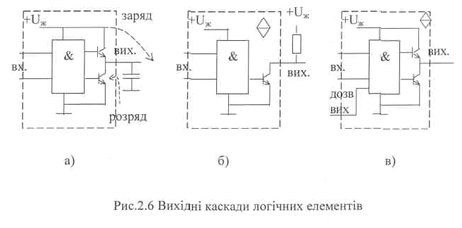 Він складається з двох послідовно ввімкнених транзисторів, якими керує логічна частина елемента. Один з транзисторів завжди відкритий, а другий-закритий. Відкриті транзистори, маючи малий опір, швидко перезаряджають ємність навантаження і паразитну ємність монтажу, через це елементи такого типу знайшли широке використання. В логічному елементі з відкритим колектором (рис. 2.6., б) у якості вихідного каскаду використовується транзистор, колектор якого не підключений до навантаження. Виходи таких елементів повинні бути підключені за допомогою зовнішнього резистору до джерела живлення. На рис. 2.6, в поданий логічний елемент з трьома станами виходу: логічний елемент має управляючий вхід, одне з значень сигналу на якому переводить вихідні транзистори в закритий стан, що відповідає високоімпедансному стану виходу (сотні кілоом). Елементи з трьома станами розроблені спеціально для використання у якості вихідного управляючого буфера для підключення цифрових блоків до магістралей.