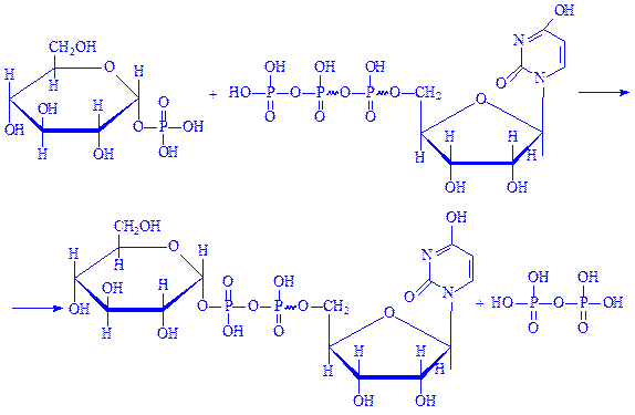 Глюкозо-1-фосфат під впливом ферменту глюкозо-1-фосфат-уридилтрансферази вступає в реакцію з УТФ, утворюючи УДФ-глюкозу: