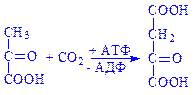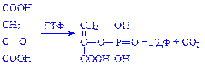 2) фосфорилююче декарбоксилювання. Щавелевооцтова кислота декарбоксилюється, приєднуючи фосфат (ГТФ або ІТФ) з утворенням фосфоенолпіровиноградної кислоти, реакцію каталізує фосфоенолпіруваткарбоксикіназа: