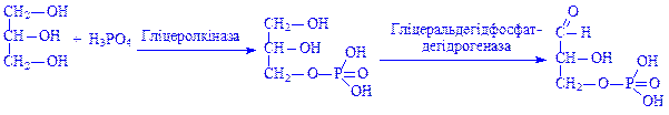 ГТФ (або ІТФ) ресинтезується за рахунок АТФ. Таким чином, на синтез фосфоенолпіровиноградної кислоти, витрачається дві молекули АТФ. Дефосфорилування фруктозо-1,6-дифосфата до фруктозо-6-фосфата. Фруктозо-1,6-дифосфат гідролізується на фруктозо-6-фосфат і фосфорну кислоту. Реакцію каталізує фермент фруктозодифосфатаза. Цей фермент, виділений з печінки, вдалося отримати в кристалічній формі. Він утворений двома субодиницями, його молекулярна маса 127000. Фермент каталізує реакцію: Фруктозо-1,6-дифосфат + Н2О ® Фруктозо-6-фосфат + Н3РО4 Реакцію у зворотному напрямку каталізує фосфофруктокіназа у присутності АТФ. Активністю обох ферментів, діючих на одні і ті ж субстрати, але каталізуючих реакції, що йдуть в протилежних напрямках, управляють алостеричні інгібітори: фосфофруктокіназу гальмує АТФ; фруктозодифосфатазу – АМФ. Решта ферментів ланцюга гліколіза діє оборотно і бере участь однаково як при гліколізі, так і при гліконеогенезі. Ланцюг, що починається з щавелевооцтової кислоти. Щавелевооцтова кислота є попередником фосфоенолпіровиноградної кислоти. В той же час вона є продуктом окислення ацетил-КоА у циклі Кребса. Тому, всі проміжні продукти циклу Кребса можуть служити попередниками глюкози і глікогену, а також, всі амінокислоти, які здатні перетворюватися в компоненти циклу Кребса, є глікогенутворюючими амінокислотами. Таким чином, щавелевооцтова кислота відіграє фундаментальну роль в гліконеогенезі, оскільки через неї в ланцюг біосинтезу глікогену і глюкози вступають піровиноградна кислота, проміжні продукти циклу Кребса і глікогенутворюючі амінокислоти. Ланцюг, що починається з гліцерину. Гліцерин входить в ланцюг синтезу глікогену через реакцію:
