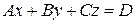 Для того чтобы построить график этой функции нужно из каждой точки М (х,у) плоскости ХОY поднять перпендикуляр z и потом объединить полученные точки аппликат. Следует учесть, что графическое изображение функции двух переменных в трехмерном декартовом базисе в общем случае представляет некоторую поверхность. В лекции 8 мы показывали, что построение линии «по точкам» страдает приближенностью и даже ошибочностью, потому что не может учесть такие важные точки, как разрывы, экстремумы и т.д. Поэтому если надо построить график поверхности, решают вопрос в общем виде, определив ее тип, а потом переходят к построению. Если на плоскости самая простая и самая изученная линия – это прямая, то наиболее простая поверхность в пространстве – это плоскость, уравнение которой в общем виде записывается так:
