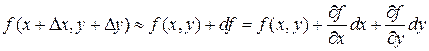 Это выражение является аналогом формулы для дифференциала функции одной переменной. Добавлено новое слагаемое, и простая производная функции по одной переменной х заменена частными производными по х и у. Для функции трех переменных будет тройная сумма. Напомним, что дифференциал функции приближенно равен ее приращению: