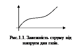 Характер залежності струму від напруги для газу представлений на рис.1.1. При невеликих значеннях напруги виконується закон Ома. У цій області запас позитивних і негативних часток достатній і практично постійний. При збільшенні напруги позитивні іони не встигають рекомбінувати й розряджаються на електродах. Це відповідає горизонтальній ділянці кривої. При подальшім збільшенні напруги внаслідок ударної іонізації з'являється самостійна провідність, і струм знову починає рости зі збільшенням напруги.