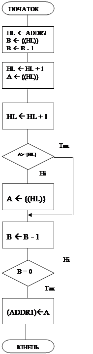 Нехай довжина масиву даних знаходиться в пам’яті за адресою ADDR2, а сам масив розміщується, починаючи з адреси ADDR3. Програма повинна знайти максимальне значення і помістити його в комірку за адресою ADDR1.