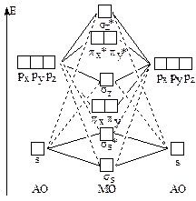 Другие атомы второго периода содержат помимо 2s-АО также и 2рx-, 2py- и 2pz-АО, которые при взаимодействии могут образовывать s- и p-МО. Для атомов О, F и Ne энергии 2s и 2p АО существенно различаются и можно пренебречь взаимодействием 2s-АО одного атома и 2р-АО другого атома, рассматривая взаимодействие между 2s-АО двух атомов отдельно от взаимодействия их 2р-АО. Учитывая, что прямое перекрывание pz-pz с образованием s-связи, сильнее, чем боковое перекрывание px-px или py-py с образованием p-связей, то энергия sz- МО будет ниже, чем энергии pz- и py-МО, а энергия sz-МО выше, чем энергии px*- и py*-МО. Схема МО для молекул О2, F2, Ne2 имеет следующий вид.