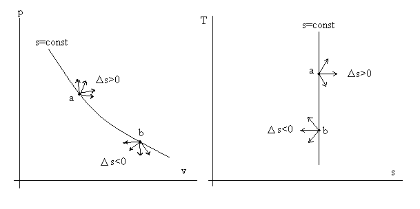 На адиабате s = const возьмем произвольную точку «а». Все процессы, выходящие из т. «а» вправо (см. диаграмму T – s), характеризуются ростом энтропии Δs > 0. Все процессы, выходящие из точки «в» влево (опять см. диаграмму T – s) характеризуются уменьшением энтропии Δs < 0. Практическую работу правила изотермы и адиабаты проиллюстрируем на примере.