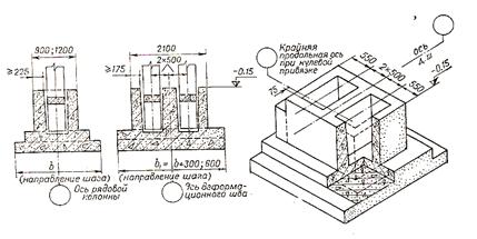 По способу возведения фундаменты делят на монолитные и сборные. Под колонны каркасного здания устраивают, как правило, столбчатые фундаменты с подколонниками стаканного типа, а стены опирают на фундаментные балки. Ленточные и сплошные фундаменты предусматривают редко, как правило, на слабых, просадочных грунтах и при больших ударных нагрузках на грунт технологического оборудования. Унифицированные монолитные железобетонные фундаменты имеют ступенчатую форму с подколонником стаканного типа для заделки колонн (рис.2).