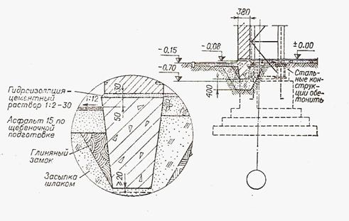 Фундаментные балки устанавливают на подливку из цементно-песчаного раствора толщиной 20 мм. Этим раствором заполняют зазоры между торцами балок и стенками подколонников. По балкам для гидроизоляции стен укладывают 1-2 слоя рулонного водонепроницаемого материала на мастике. Во избежание деформации балок вследствие пучения грунтов снизу и с боков балок предусматривают подсыпку из шлака, песка или кирпичного щебня (рис.6).