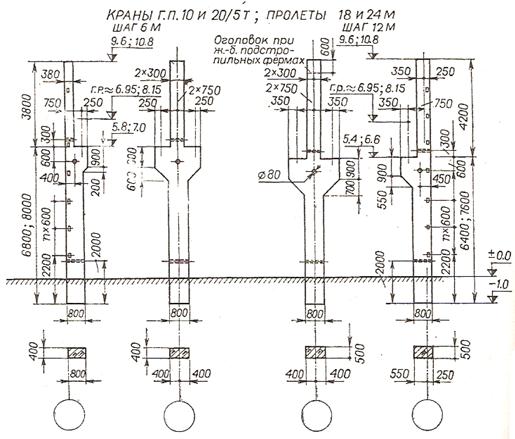 В железобетонных колоннах имеются стальные закладные элементы для крепления стропильных конструкций, подкрановых балок, стеновых панелей (в крайних колоннах) и вертикальных связей (в связевых колоннах). В местах опирания стропильных конструкций и подкрановых балок через стальные листы пропущены анкерные болты. В зданиях с подстропильными конструкциями длину колонн принимают на 600 мм меньше (см рис. 8,9,10).