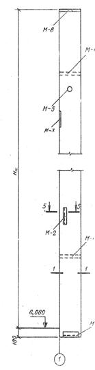 Колонны типа I имеют постоянное поперечное сечение по высоте (h = 300 мм), что позволяет размещать их верхнюю часть в зазоре между торцовой стеной и пристенной балкой покрытия и крепить их к верхнему поясу балки с помощью листового шарнира (узел 1, рис. 11). Колонны типа II имеют переменное сечение по высоте (Нв и Нн, рис. 11). Верхняя часть колонны (Нв) имеет такое же сечение, как и колонны типа I (h=300мм) и крепится к верхнему поясу стропильной балки аналогично колоннам типа I (узел 1, рис.11).