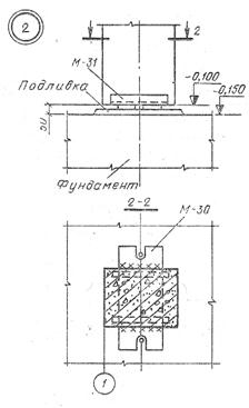 Колонны фахверков Помимо основных колонн в зданиях предусматривают фахверковые колонны, устанавливаемые в торцах зданий и между основными колоннами крайних продольных рядов при шаге 12 м и длине стеновых панелей 6 м. Предназначены они для восприятия ветровых усилий и массы стен. Фахверковые колонны шарнирно крепят к фундаменту сваркой закладных деталей колонны и опорного листа, установленного поверху фундамента строго по осям (узел 2, рис.11). Колонны фахверка крепят к конструкциям покрытия с помощью листового шарнира (узел 1, рис.11). Такое соединение обеспечивает передачу ветровых нагрузок на каркас здания и устраняет вертикальные воздействия покрытия на колонны фахверка. Унифицированные железобетонные колонны для торцового фахверка двух типов (I и II) применяются в случаях, приведенных в таблице 1. В остальных случаях применяют стальные колонны фахверков. Конструкции колонн приведены на рис. 11.