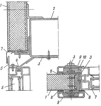 1 – стеновая панель; 2 – ригель; 3 – крепежный элемент; 4 – планка на переплете; 5 – окно; 6 – уголок; 7 – слив; 8 – уплотнитель; 9 – нащельник; 10 - утеплитель Рис. 1. Сопряжение стальных переплетов со стенами Алюминиевые переплеты имеют теплотехнические характеристики практически не отличающиеся от характеристик аналогичных окон со стальными переплетами. Алюминиевые окна предназначены для зданий с сухим и нормальным температурно-влажностным режимом при отсутствии агрессивных сред. Унифицированные конструкции алюминиевых окон изготавливают с одинарным остеклением, с двойным остеклением стеклопакетами в одинарном переплете с термокладышем, двойным и тройным остеклением (стеклопакеты и стекло) в раздельных переплетах. Максимальная высота оконных проемов с алюминиевыми переплетами не должна превышать 7,2 м. Окна крепят к ригелям. Вес окон и ветровая нагрузка воспринимается ригелями и цокольными панелями. Окна состоят из алюминиевой коробки и створок, изготавливаемых из алюминиевых профилей. Стекла и стеклопакеты устанавливают в переплетах на опорные фиксирующие прокладки. Остекление закрепляют алюминиевыми профильными штапиками-защелками через резиновые профили (рис. 2).