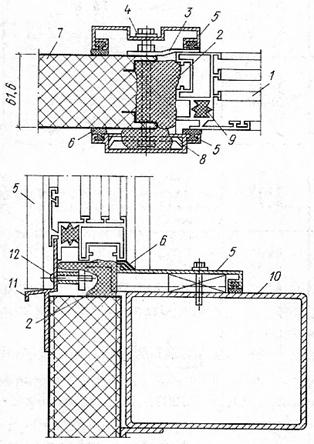 Рис. 2. Сопряжение алюминиевых переплетов со стенами Железобетонные переплеты используются в зданиях с повышенной влажностью воздуха и при нормальном температурно-влажностном режиме. Эти окна выполняют из отдельных переплетов и в виде готовых стекложелезобетонных панелей, имеющих длину 6 м. Железобетонные переплеты стыкуют по высоте без оконных коробок, соединяя между собой цементно-песчаным раствором. Крепят их к откосам проемов за счет выпусков арматуры, а переплеты верхнего яруса с помощью ершей. Швы между переплетами и стеной заделывают раствором, а зазор между перемычкой и переплетом (10 мм) – эластичными синтетическими материалами. Железобетонные переплеты не подвергаются загниванию и коррозии, но трудоемки в изготовлении и тяжелы в устройстве. Деревянные переплеты и панели применяют во временных зданиях и в зданиях с нормальным температурно-влажностным режимом. Отдельные переплеты-блоки состоят из коробок и створок (раздельных и спаренных). Блоки располагают в один или несколько ярусов. При высоте проема более 7,2 м между ярусами блоков укладывают деревянные ригели. Ригели и деревянные импосты, устанавливаемые через 3 м по ширине проема, воспринимают ветровые усилия. Крепят оконные блоки к откосам, перемычкам, ригелям и импостам гвоздями и ершами. Стыки конопатят паклей и закрывают нащельником. В стенах из крупных панелей ленточные и сплошные световые проемы целесообразно заполнять деревянными панелями. Панели имеют размеры 1,3х6; 1.8х6 м. Они могут быть глухими и с открывающимися створками. Элементы панели соединяют между собой шипами и склеивают. К колоннам панели крепят коротышами из уголков, а между собой – гвоздями. Зазоры между панелями заполняют смоленой паклей или упругими синтетическими материалами и с обеих сторон закрывают нащельниками. Деревянное заполнение проемов нетрудоемкое в изготовлении, имеет небольшой вес, но возгораемое, подвержено короблению и загниванию, менее прочное и светоактивное в сравнении с другими материалами, применяемыми для заполнения оконных проемов. На рис. 3 изображено сопряжение створок деревянных окон с рамой переплета.