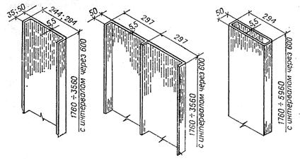 Беспереплетное заполнение оконных проемов. К беспереплетным заполнениям относят стеклоблоки, листы из стеклопластика и профильное стекло. Заполнения из стеклоблоков обеспечивают герметичность ограждений, повышенное сопротивление теплопередаче, снижают тепловую радиацию. Они гигиеничны, легки в уборке. Заполнения оконных проемов из стеклоблоков применяют в промышленных зданиях с кондиционированием воздуха и вакуумной гигиеной (приборостроение, радиоэлектроника и т.п.) и для производств с повышенными гигиеническим требованиями (предприятия пищевой и легкой промышленности, часовые заводы и т.п.). К недостаткам ограждений из стеклоблоков следует отнести возможные их разрушения в связи с усадочными и температурными деформациями от неравномерного прогрева и разности коэффициентов линейного расширения стекла и материала швов (бетона, раствора). В промышленных зданиях для заполнения оконных проемов применяют стекложелезобетонные панели, имеющие номинальную длину 6 м, где светопрозрачным элементом служат стеклоблоки. Панели устанавливают на стальные столики и крепят к колоннам, как и стеновые панели. Швы между панелями заполняют жгутами из пороизола или гернита и промазывают мастикой. Стекложелезобетонные панели дешевле стальных на 40-60%. В зданиях со стенами из волнистых асбестоцементных или алюминиевых листов целесообразны светопрозрачные ограждения из волнистых стеклопластиков. Стеклопластиковые листы по размерам и профилю соответствуют алюминиевым и асбестоцементным листам и имеют толщину 1,5 – 2,5 мм. Крепление их к ригелям аналогично креплениям асбестоцементных и алюминиевых листов. Заполнение оконных проемов профильным стеклом осуществляют из отдельных элементов и из панелей. Стеклопрофилит (стекор) имеет сечение в виде швеллера, двойного швеллера и коробки (коробчатого сечения) (рис. 4). В неотапливаемых зданиях применяют стекор швеллерного сечения; в отапливаемых – коробчатого типа на высоту не менее 2,4 м от пола (выше возможно применение стекора швеллерного типа); в герметических зданиях – только коробчатого типа стекор.