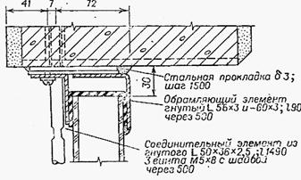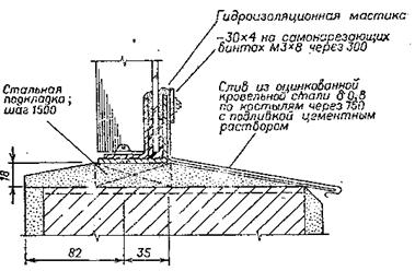 Стекор применяют для ленточного остекления высотой 1,8 – 3,6 м и остекления отдельных проемов высотой 2,4 – 6 м. При сплошном остеклении высотой до 15, 6 м в проемы устанавливают стальной фахверк из горизонтальных ригелей, которые располагают между ярусами остекления и вертикальных импостов- тяжей, связывающих ригели между колоннами. Стальные горизонтальные ригели опирают на опорные консоли колонн. Стекор крепят к стеновым перемычечным панелям и ригелям с помощью винтов, скрепляющих обоймы стекора с крепежными уголками. Обоймы образуют непрерывным обрамляющим гнутым уголком. Сопряжение уплотняют прокладками из морозостойкой резины и защищают от увлажнения гидроизоляционной мастикой (рис.5). На основе стеклопрофилита изготавливают панели. Панели с заполнением стекором швеллерного типа имеют номинальные размеры 1,8х6; 2,4х6 м, коробчатого типа - 1,8х6; 2,4х6 и 3х6 м. Панель представляет собой стальную раму из гнутых профилей на сварке, заполненную стекором. Для обеспечения жесткости в вертикальных швах панели с шагом 1 м размещают тяжи. В местах соприкосновения стеклопрофилита с рамой устанавливают прокладки из губчатой резины. Панели опирают на стальные столики и крепят к колоннам анкерами и болтами. Швы между панелями заделывают пороизолом и закрывают нащельником.