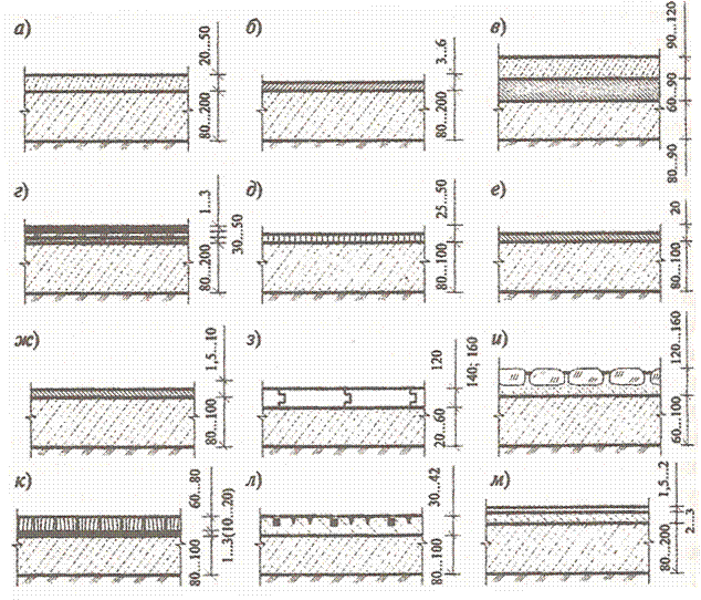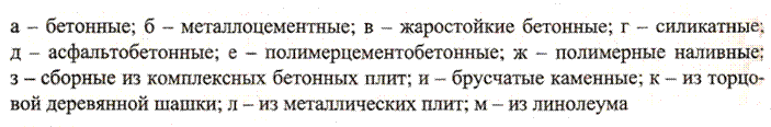 Требования, предъявляемые к полам промышленных зданий: - высокая механическая прочность; - ровная и гладкая поверхность; - не скользить; - мало истираться; - не пылить; - иметь хорошую эластичность, чтобы не повреждать предметы, падающие на пол; - бесшумность при ходьбе и езде; - стойкость при возгорании; - водонепроницаемость; - стойкость к агрессивной среде (к щелочам, кислотам и т.п.); - не вызывать искрения; - быть индустриальными; - легко ремонтироваться и очищаться; - быть экономичными (стоимость полов составляет от 5 до 25% от общей стоимости одноэтажного производственного здания). В максимальной степени пол промышленного здания должен удовлетворять тем требованиям, которые вытекают из специфики данного производства. В одноэтажных промышленных зданиях полы устраивают по грунту. Основными элементами пола являются: - покрытие; - подстилающий слой, распределяющий нагрузки на основание; - прослойка (связующий слой между покрытием и подстилающим слоем); - стяжка (устраивается для создания жесткой корки по нежестким и пористым материалам или для придания полу уклона); - гидроизоляция; - теплоизоляция. По типу покрытия полы делят на сплошные и из штучных элементов. К сплошным полам относятся: бетонные, ксилолитовые, пластмассовые, цементные, асфальтовые, щебеночные, глинобитные и т.п. К полам из штучных элементов относят плиточные, рулонные, брусчатые, дощатые и др. Подстилающие слои могут быть песчаными, шлаковыми, гравийными, щебеночными, глинобитными, булыжными, бетонными и др. Толщина подстилающего слоя назначается по расчету и должна быть не менее: песчаного – 60; шлакового, гравийного, щебеночного, глинобитного – 80; булыжного – 120; бетонного – 100 мм. Сыпучие подстилающие слои устраивают для полов из штучных материалов и при плотных грунтах основания, а бетонные – для сплошных полов и при слабых грунтах основания. Прослойки выполняют из цементно-песчаного раствора, жидкого стекла, битумной или дегтевой мастики и из песка. В полах с покрытием из чугунных и стальных плит прослойки устраивают песчаными или из мелкозернистого бетона. Стяжки выполняют из цементно-песчаного раствора, ксилолита, бетона. Гидроизоляция устраиваемая для защиты полов от сточных вод и других жидкостей располагается под покрытием пола, а для защиты от капиллярного поднятия грунтовых вод – под подстилающим слоем. В первом случае ее выполняют оклеечной: 2-4 слоя изола или гидроизола; 3-5 слоев толя, толь-кожи на соответствующих мастиках. Во втором случае – наливная из одного слоя щебня, пропитанного битумом; асфальтовая, асфальтобетонная или оклеечная из двух слоев изола, гидроизола на мастике. Звуко- и теплоизоляцию устраивают из минераловатных стекловолокнистых плит, ДВП, легких бетонов и сыпучих материалов (шлак, песок и т.п.). Грунты основания должны исключать возможность общих и местных деформаций пола. Слабые грунты укрепляют трамбованием. Основные типы полов промышленных зданий приведены на рис. 1.