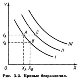 На рис. 3.2 товарный набор А включает ХА единиц товара X и YА единиц товара Y, товарный набор В включает ХB единиц товара X и YB единиц товара Y. Если с точки зрения данного потребителя наборы А и В равноценны, то точки А и В лежат на одной и той же кривой безразличия. Кривые безразличия обладают следующими свойствами. А. Кривая безразличия, лежащая выше и правее другой кривой, представляет собой более предпочтительные для данного потребителя наборы товаров. Б. Кривые безразличия имеют отрицательный наклон В. Кривые безразличия никогда не пересекаются. Г. Кривая безразличия может быть проведена через любую точку пространства товаров. Говорят еще, что кривая безразличия не имеет "толщины". Это свойство любых линий в Евклидовой геометрии, оно является безусловно определенной идеализацией, абстракцией реального мира. Чтобы сделать его более реалистичным, необходимо при выборе единицы измерения товаров учитывать порог восприятия. Д. Кривые безразличия выпуклы к началу координат.