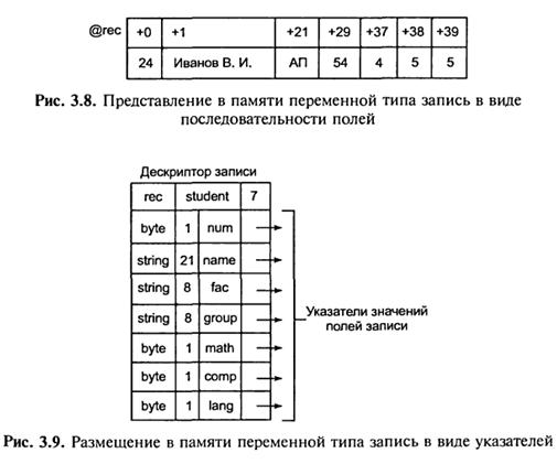 Записи Запис – це комбінований тип, значення якого представляють собою нетривіальну структуру даних. Вони складаються з декількох полів різного типу, доступ до яких здійснюється по їх іменам. Записи представляють собою засіб для представлення програмних моделей реальних об’єктів предметної області, так як кожен такий об’єкт володіє декількома властивостями, які можуть описуватись даними різних типів. Приклад запису – набір даних про співробітника кафедри. Об’єкт «співробітник» може володіти наступними властивостями: – табельний номер – ціле додатне число; – прізвище, ім’я, по-батькові – рядок символів і т.д.; – стать – символ; – вчена ступінь – рядок символів; – заробітна плата – дійсне число; – ти ін. В пам’яті ця структура може бути представлена в одному з двох видів: – у вигляді послідовності полів, які займають неперервну область пам’яті (рис. 3.8). Щоб отримати доступ до будь якого елемента запису, потрібно знати адресу початку запису і зміщення відносно початку. При цьому досягається економія пам’яті комп’ютера, але затрачується зайвий час на обчислення адрес полів; – у вигляді зв’язного списку з вказівниками на значення полів запису (рис. 3.9). При такій організації має місце швидкий доступ до елементів, але неекономна трата пам’яті для збереження.