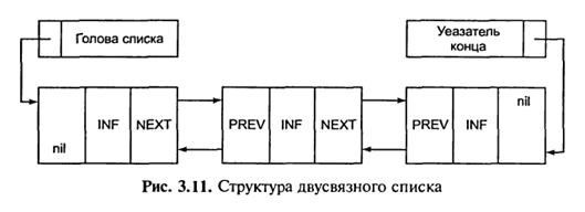 На рис. 3.10 приведена структура однозв’язного списку. Тут поле INF – інформаційне поле, яке містить дані, NEXT – вказівник на наступний елемент списку. Голова списку – вказівник на початок списку. Вказівник на наступний елемент останнього елемента містить значення nil, це є ознакою останнього елемента.