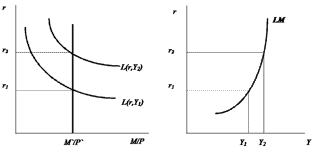 При неизменном количестве реальных кассовых остатков рост объема продукта с уровня Y1 до Y2 приводит к сдвигу кривой предпочтения ликвидности вправо-вверх. Это обуславливает форму кривой LM, описывающей взаимосвязь планируемого ВВП (Y) и процентной ставки (r): она имеет положительный наклон. Следует отметить также, что в случае, если мы рассматриваем только трансакционный спрос на деньги, переходя от взглядов теории предпочтения ликвидности к количественной теории, то соответствующие кривые становятся вертикальными: