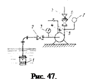Для создания большего напора и лучшего отекания жидкости лопатками придают специальную выпуклую форму, причем рабочее колесо должно вращаться выпуклой стороной лопаток в направлении нагнетания. Центробежный насос должен быть оборудован следующей арматурой и приборами (рис. 47): приемным обратным клапаном с сеткой 1. предназначенным для удержания в корпусе и всасывающем патрубке насоса воды при его заливе перед пуском; сетка служит для задержания крупных взвесей, плавающих в воде; задвижкой 2 на всасывающем патрубке, которая устанавливается около насоса; вакуумметром 3 для измерения разрежения на всасывающей стороне. Вакуумметр устанавливается на трубопроводе между задвижкой и корпусом насоса; краном 4 для выпуска воздуха при заливе (устанавливается в верхней части корпуса); обратным клапаном 5 на напорном трубопроводе, предотвращающем движение воды через насос в обратном направлении при параллельной работе другого насоса; задвижкой 6 на напорном трубопроводе, предназначенной для пуска в работу, остановки и регулирования производительности и напора насоса; манометром 7 на напорном патрубке для измерения напора, развиваемого насосом; предохранительным клапаном (на рисунке не указан) на напорном патрубке за задвижкой для защиты насоса, напорного патрубка и трубопровода от гидравлических ударов; устройством 8 для залива насоса. В связи с тем, что насосные установки часто включаются в основной комплекс оборудования для регулирования режимов работы различного назначения, они могут быть оборудованы разнообразными приборами автоматики. Центробежные насосы классифицируют по: 1) числу колес [одноступенчатые (одноколесные), многоступенчатые (многоколесные)]; кроме того, одноколесные насосы выполняют с консольным расположением вала – консольные; 2) напору [низкого напора до 2 кгс/см2 (0,2 МН/м2), среднего напора от 2 до 6 кгс/см2 (от 0,2 до 0,6 МН/м2), высокого напора больше 6 кгс/см2 (0,6 МН/м2)]; 3) способу подвода воды к рабочему колесу [с односторонним входом воды на рабочее колесо, с двусторонним входом воды (двойного всасывания)]; 4) расположению вала (горизонтальные, вертикальные); 5) способу разъема корпуса (с горизонтальным разъемом корпуса, с вертикальным разъемом корпуса); 6) способу отвода жидкости из рабочего колеса в спиральный канал корпуса (спиральные и турбинные). В спиральных насосах жидкость отводится непосредственно в спиральный канал; в турбинных жидкость, прежде чем попасть в спиральный канал, проходит через специальное устройство – направляющий аппарат (неподвижное колесо с лопатками); 7) степени быстроходности рабочего колеса (тихоходные, нормальные, быстроходные); 8) роду перекачиваемой жидкости (водопроводные, канализационные, кислотные и щелочные, нефтяные, землесосные и др.); 9) способу соединения с двигателем [приводные (с редуктором или со шкивом), непосредственного соединения с электродвигателем с помощью муфт]. Насосы со шкивным приводом встречаются в настоящее время редко.