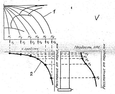 Рис. 9.7. Количественная связь термокинетической -диаграммы(1) с графиком прокаливаемости, построенным методом торцевой закалки (2)