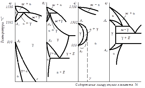 Рис. 14.1. Влияние легирующих элементов на полиморфизм железа: а – Ni, Mn (аустенитные); б – Mn; в – V, Si, Al, Cr, W, Mo (ферритные); г – B, Zn, Nb