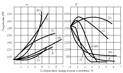 Легирующие элементы оказывают большое влияние на положение точек S (0,8 % С) и E (2,14 % С) диаграммы «железо-цементит» (рис. 7.1): Ni, Co, W, Cr, Mn снижают, а V, Ti, Nb повышают. Легирующие элементы в стали могут быть в твердом растворе, карбидной фазе или в виде интерметаллических соединений и влияют на свойства феррита и аустенита по мере увеличения их содержания в сталях (рис. 14.2).
