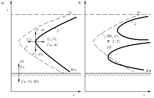 Некарбидообразующие элементы, кроме Со, замедляют кинетику распада аустенита (рис.14.3,а). Карбидообразующие элементы вносят не только количественные, но качественные изменения в кинетику изотермического превращения аустенита (рис.14.3,б).