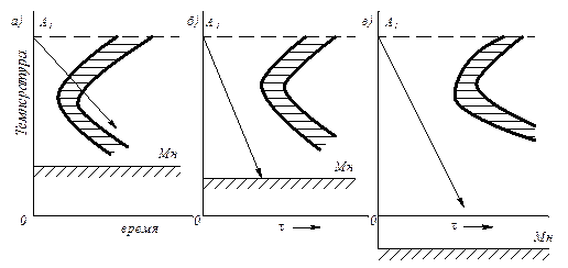 Рис. 14.5. Диаграмма изотермического распада аустенита сталей: а - перлитного класса (0,1 - 1,5 % С), содержащих менее 5 - 7 % легирующих элементов; б - мартенситного класса (0,3 - 0,6 % С), содержащих 10 - 15 % легирующих элементов; в - аустенитного класса (0,1 - 0,5 % С), содержащих более 15 % легирующих элементов